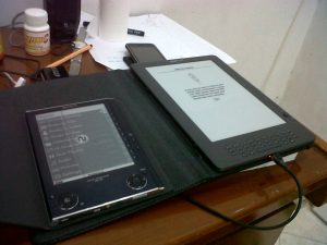 Nah Kindle DX ini top abis. tipis, ringan (eits.. kindle nya sih ringan, ditambah covernya jadi berat. Dibacanya tidak silau, walaupun ada kekurangan yaitu sulit lompat-lompat halaman, jadi cocoknya utk baca buku yang dari depan sampai belakang dibaca berurutan. Nah enaknya itu, cara kita membeli buku itu semudah kita membeli program di ipad/iphone. klik and boom, langsung bukunya ada di kindle. Dan… amazon juga meniru model apple (selain model belinya), yaitu setiap pembelian kita, bisa digunakan di banyak alat. As long as kita login dengan nama yang sama. Bisa baca di ipad, mac, pc, iphone, blackberry (tapi ini versi indonesianya masih belum ada). Dan diantara alat-alat tersebut bisa sync halaman akhirnya.